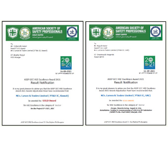 PT&D IC’s Middle East BU bagged two gold awards from the American Society of Safety Professionals (ASSP - Kuwait Chapter) for the exemplary performance in the field of Health, Safety & Environment (HSE) for projects in Kuwait and UAE. The awards are part of the ASSP Gulf Cooperation Council HSE Excellence Awards 2021.